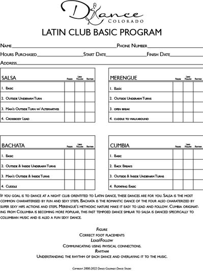 Basic Program - The Basic Program is designed to teach you the basic figures necessary to help you navigate around the dance floor. In this level, you will learn three to four figures per dance, develop a beginning understanding of rhythm, and learn basic leading and following skills. Preparing you for the medal programs.